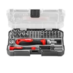 Os diferentes tipos de bits e uma alça TPR catraca são fornecidos em um estojo Ronix.